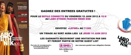 Faubourg Média et Labo Ethnik proposent au public de gagner des places gratuites pour le défilé du Vendredi15 juin à 19H en envoyant « LEFWE » au 71300. Un tirage au sort aura lieu avant le début du Labo. Les gagnants recevront une invitation par sms .
