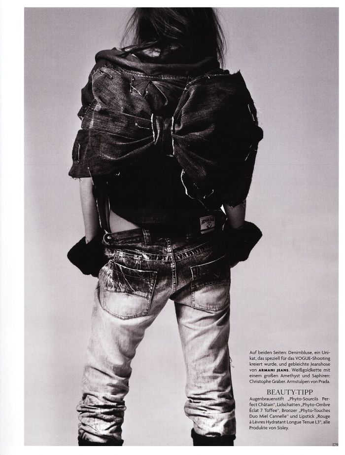 Le Printemps-Eté 2010 sera Denim ou ne sera pas! Dans le Vogue Germany de mai 2010, le mannequin Catherine McNeil pose tout de jeans vêtue pour les photographes Indlekofer & Knoepfel.
