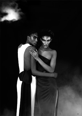 Sessilee Lopez, Aminata Niaria, Lyndsey Scott & Adama Diallo, quatre déesses noires sous l’objectif d’Alexandra Catiere pour le troisième numéro de Lurve Magazine. Intitulé « Stairway to Heaven », cet édito met en scène les quatre Beautés drapées de robes longues, accessoires et maquillage tribal à l’honneur. L’effet noir et blanc et la fumée nous transportent dans un autre univers, une ambiance de rite lunaire très féminin.