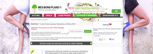 Avant votre shopping rendez-vous sur http://www.mes-bons-plans.fr/sarenza  pour récupérer votre bon réduction Sarenza. Codes promos, réductions exclusives, ventes flash ou ventes privée, également la livraison gratuite, tout pour bénéficier des derniers bons plans pour votre shopping chez Sarenza.