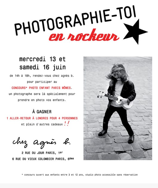 Les mercredi 13 et samedi 16 juin 2012 de 14h à 18h, rendez-vous chez agnès b. pour participer au concours photo enfant Paris Mômes. Un photographe sera là spécialement pour prendre en photos vos enfants.