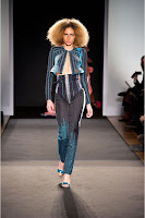 Musique Disco (qui dit mannequins noirs dit musique dans la peau n’est-ce-pas?), du lamé or, des strass, du cuir, des plumes, jaune, violet, fushia, vert des couleurs dans tous les sens… c’est trop, là honnêtement on va trop dans le cliché. Côté coiffure c’est perruques afro et big hair pour toutes, forcément on vogue sur la tendance big fro.