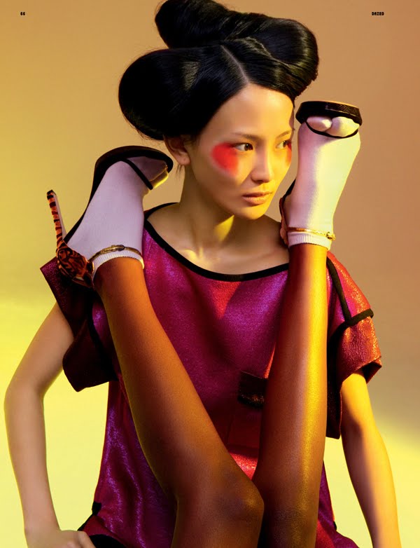La tanzanienne Flaviana Matata (Miss Tanzanie 2007) et la chinoise Ling Ling Kong posent pour Mel Bles pour l’éditio « Passing Fancy » du magazine Dazed & Confused de février 2011.