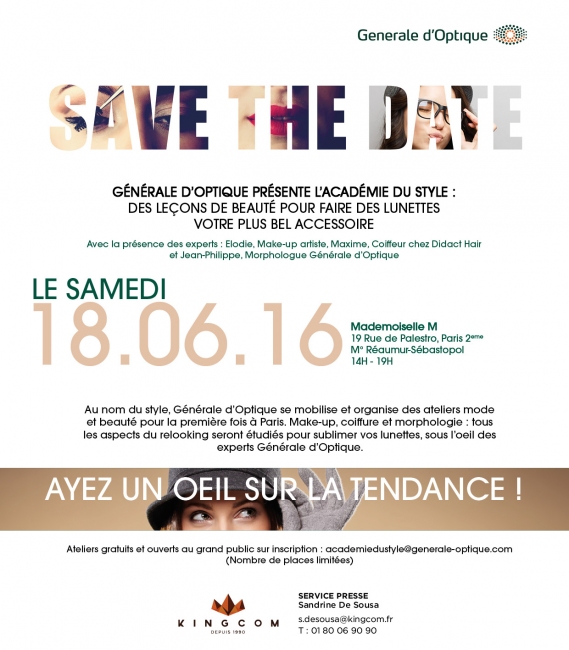 Générale d’Optique présente l’Academy du Style, le samedi 18 juin 2016, au programme 3 ateliers animés par des experts pour faire des lunettes votre plus bel accessoire.