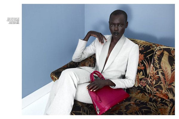 Grace Bol shot by Wendelien Daan in the « Dons Elegant Pantsuits » editorial for Elle Netherlands August 2012. Stylist Thomas Vermeer selects pieces from Rochas, Prada, Junya Watanabe, Carven Louis Vuitton, Paul Smit for the Sudanese beauty to wear.