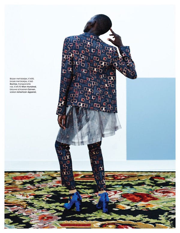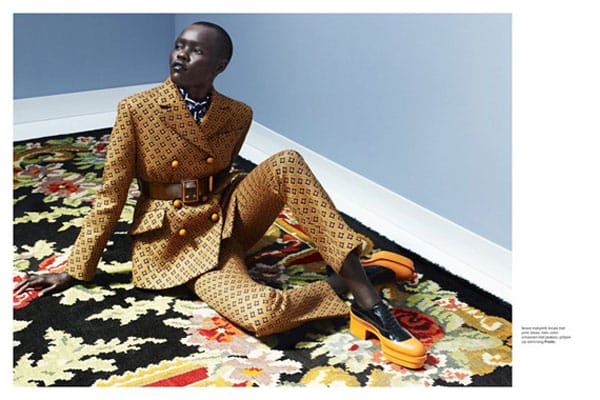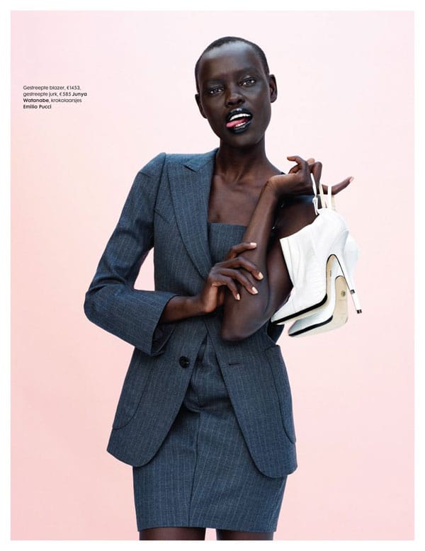 Grace Bol par le photographe Wendelien Daan pour l’édito « Dons Elegant Pantsuits » pour l’édition Néerlandaise du magazine Elle. Le styliste Thomas Vermeer a opté pour des marques telles que Rochas, Prada, Junya Watanabe, Carven Louis Vuitton, Paul Smith pour habiller la belle soudanaise.