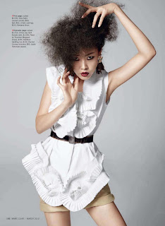 Le mannequin sud-coréen Han Jin pose pour l’édition U.S. du mag Marie Claire, l’édito intitulé « Frill Of It all » a été shooté par David Roemer, toujours super de voir des modèles asiatique avec une coupe style afro! She perfectly rocks the fro’!!
