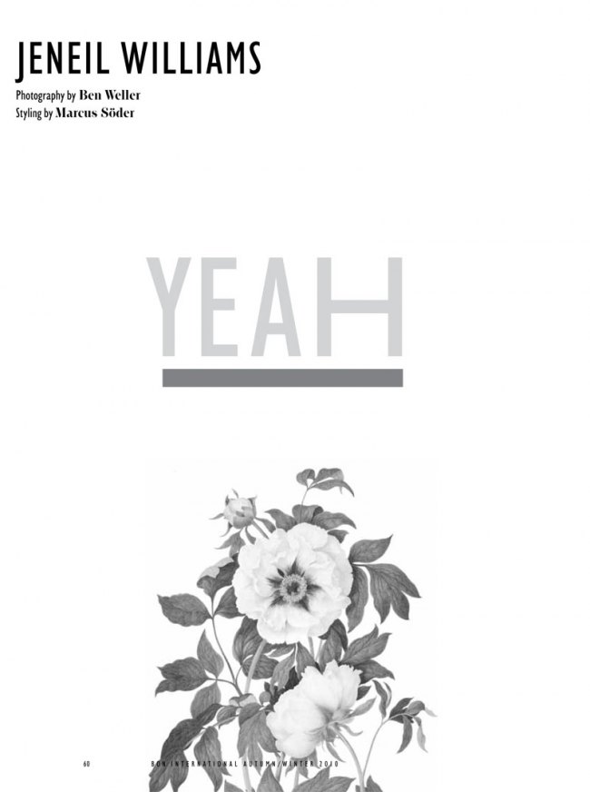 Aïssata K. 13 décembre 2010 MODE >Hot Shoot | Jeneil Williams pour Bon International > La jamaïcaine Jeneil Williams dans l’édito « Yeah » par le photographe Ben Weller pour le magazine « Bon International ». Aïssata K.Find me on: Web | Instagram