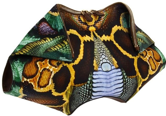 Cette magnifique pochette signée Alexander McQueen (R.I.P) fait partie de la collection Été 2010 du défunt créatur. Le « Clutch » a été présenté il y a une semaine à peine et est déjà « sold out »! Ce sac en soie et cuir marron avec sa forme plus qu’originale est complètement dans la tendance du moment. Complètement in love de ces imprimés serpent. Ce « clutch » est assez grand pour contenir l’essentiel, il pourra accompagner les plus sauvages des fashionistas cet été.