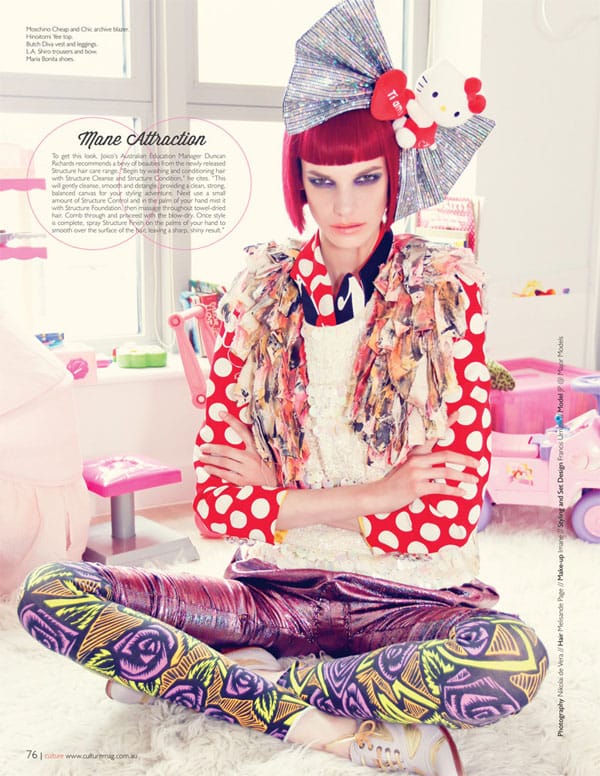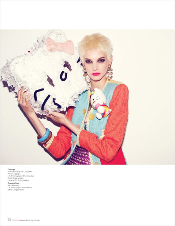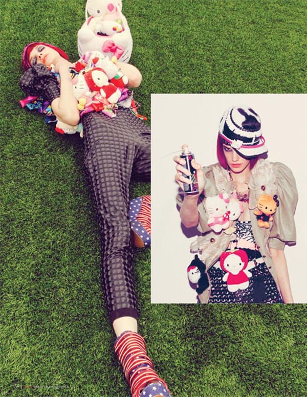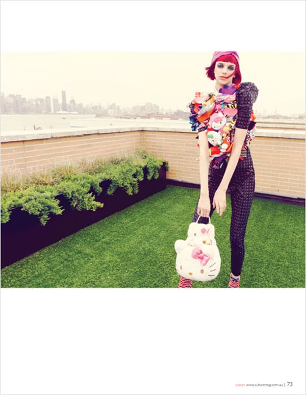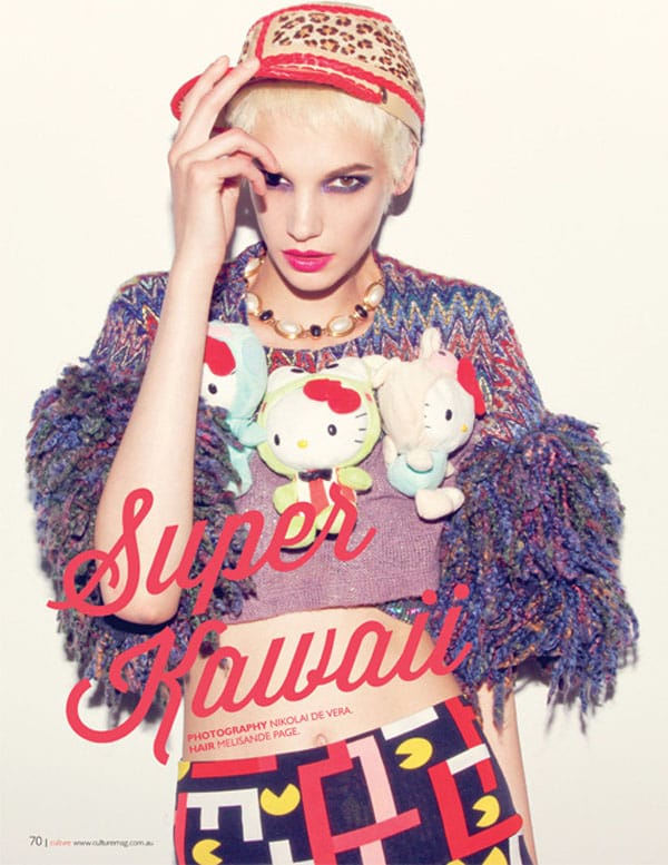 Le mannequin américain Jessica Pitti (Major Models) par Nikolai De Vera pour Culture Magazine, Août-Septembre 2012. L’édito intitulé « Super Kawaii », met en scène le mannequin dans un univers très girl, aux côtés d’Hello Kitty.