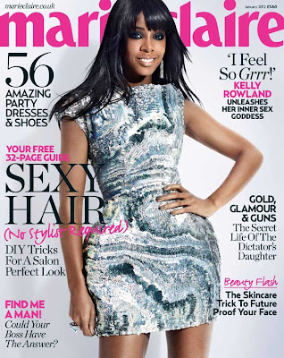 Kelly Rowland en couverture du Marie Claire UK de janvier 2012 par David Oldham. En robe à sequins par Roberto Cavali et robe à plumes par Giles, et robe à pétales, le rose est définitivement sa couleur.