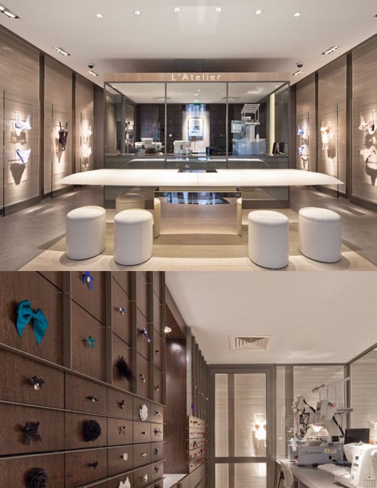 Cet atelier de personnalisation est le cœur du concept store, on découvre derrière un mur de verre des petits tiroirs qui renferment strass, pompons, nœuds, perles… un large choix de couleur pour personnaliser votre lingerie. Mille et une combinaisons possibles, laissez libre court à votre imagination, la couturière est également là pour conseiller et réaliser les créations au gré de votre imagination.