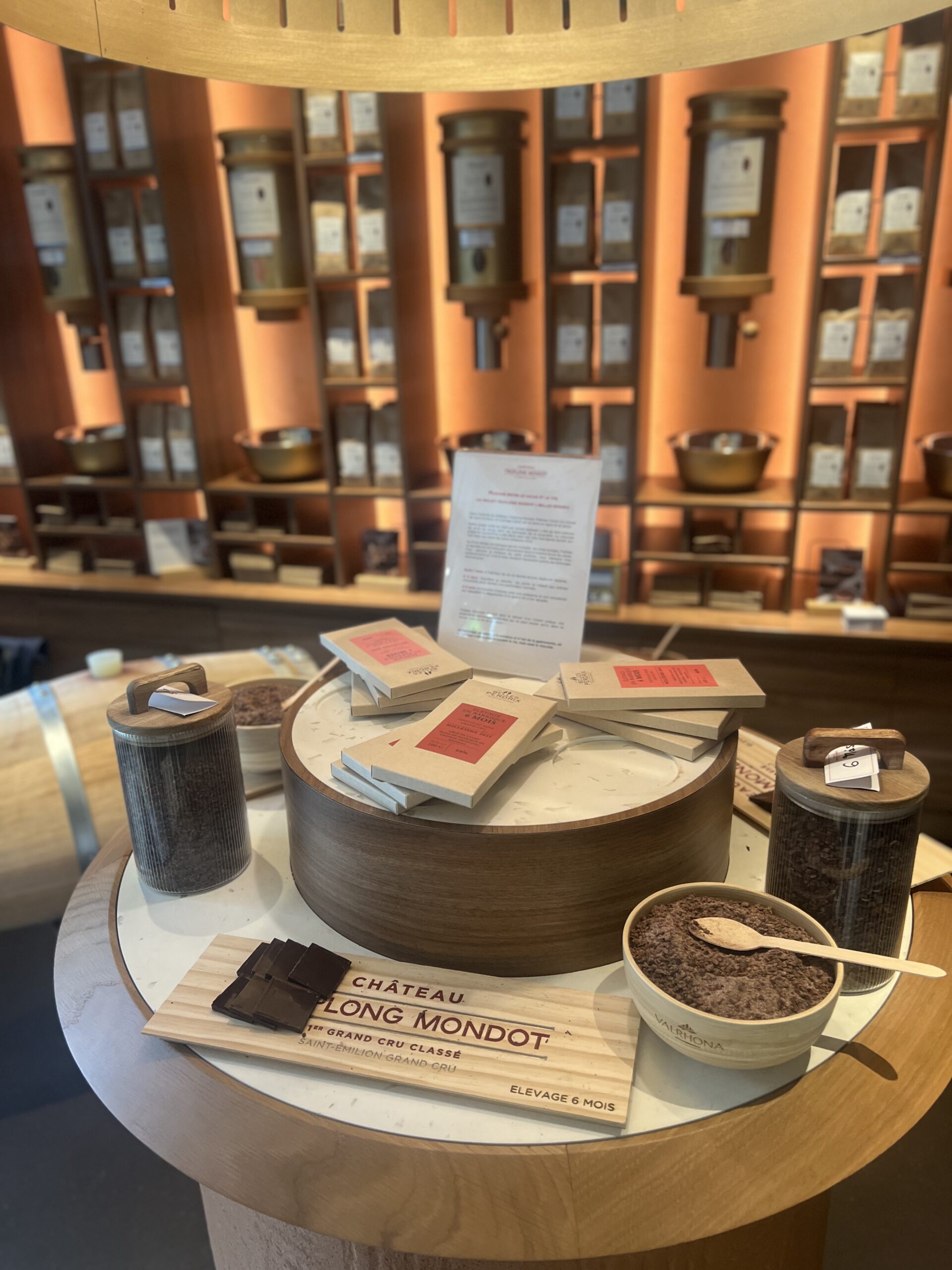 Petite surprise scénographique : chaque bûche s’accompagne d’un encrier contenant un vin du Château Troplong Mondot. Versé délicatement sur un espace réservé de l’assiette, ce liquide fait apparaître comme une encre magique, un message secret du Père Noël, clin d’œil ludique qui transforme le dessert en véritable petite cérémonie.