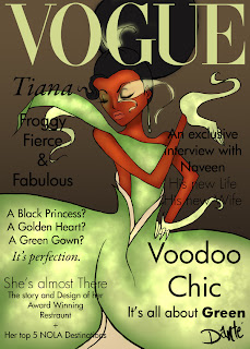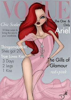 Ariel, Aurora, Beauty, White-Snow, Cinderella, Jasmin, Pocahontas andTiana play it Fashion dressed in designer clothes for eight original and fictitious covers of Vogue Magazine.