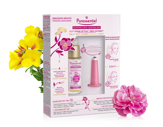 Grâce à son savoir-faire inégalé dans l’élaboration des soins de santé, de bien-être et de beauté à base d’huiles essentielles et d’huiles végétales, la recherche PURESSENTIEL investit aujourd’hui l’univers de la cosmétique avec un duo jeunesse totalement inédit : l’Elixir Essentiel® Bio et la Ventouse Visage & Yeux Lift Vac®, une toute nouvelle méthode de massage beauté brevetée !