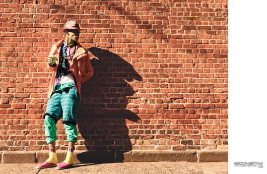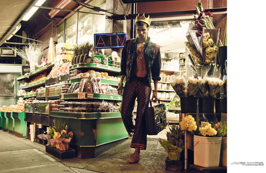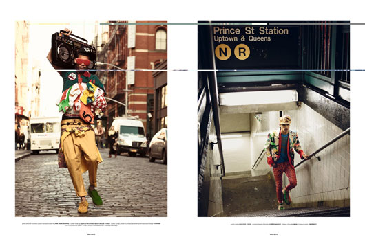 Captured in the streets and New York famous neighborhood of « Prince Street », in Soho, know for it’s shops and Fashion boutiques. Rafael became the Prince durint this shooting: neons, crowns, diverse prints and layered pants, boom box… an 80’s inspired shoot, for sure Rafael rules in Prince Street.