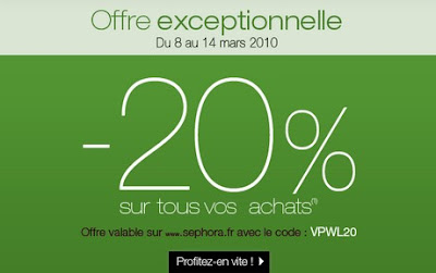 Aïssata K. 9 mars 2010 MODE >Sephora | -20% sur votre commande >Sephora vous offre une réduction de -20% sur votre commande, offre du valable du 8 au 14 mars 2010 sur www.sephora.fr, le code promo à utiliser est VPWL20. Aïssata K. Find me on: Web | Instagram