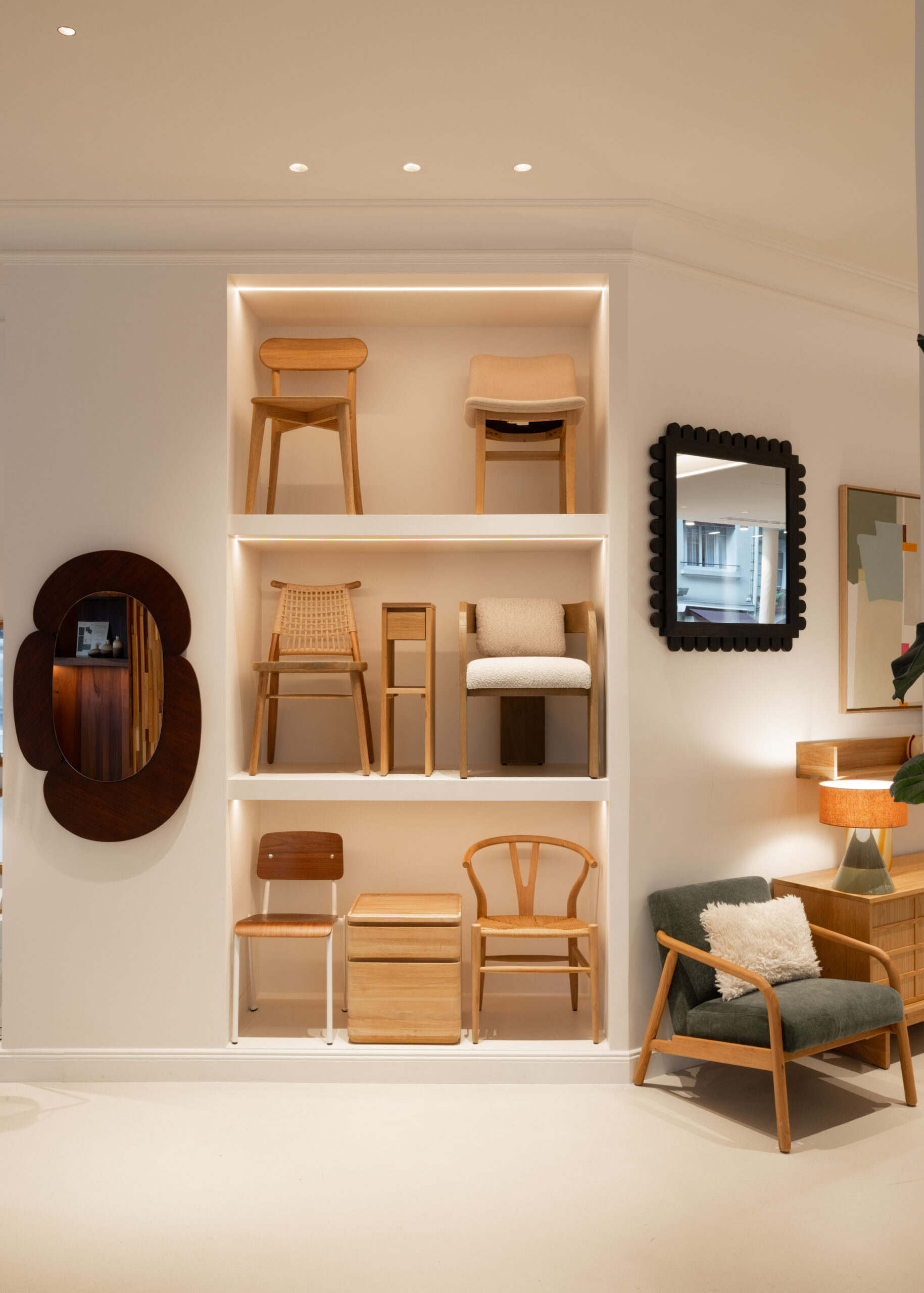 Au centre de la boutique, une œuvre monumentale attire immédiatement le regard. Baptisé “l’arbre de l’engagement”, cet élément sculptural a été réalisé à partir de chutes de bois issues de meubles cassés ou démontés, revalorisées par l’atelier circulaire de la marque. Conçu par le menuisier-ébéniste Mathieu Brosset, l’arbre rassemble 17 800 morceaux de bois assemblés à la main, symbolisant la démarche zéro déchet et le respect de la matière première.