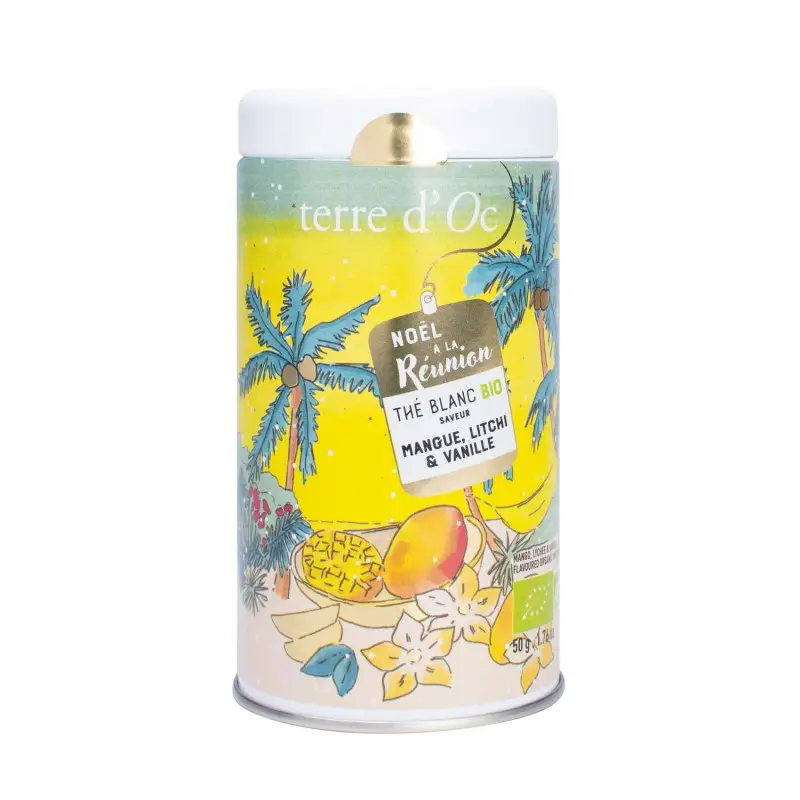 Thé de NOËL à la Réunion : Une création empreinte du festin créole traditionnel de Noël. Un thé blanc majestueux aux nuances florales, parfumé de mangue et de litchi, rehaussé par une touche de vanille.