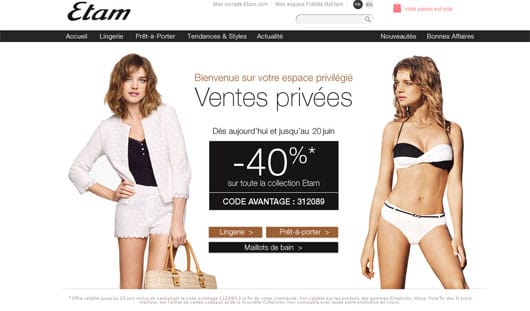 Comme chaque année, Etam organise ses Ventes Privées avant les soldes d’été ! Jusqu’au 26 juin, profitez d’une offre de -40% sur toute les collections Lingerie et Prêt-à-porter (hors collections Muse et Pure Fit, sur l’achat de cartes cadeaux et sur les produits de bain IT Price) sur le site ETAM.Com et dans votre boutiques ETAM.