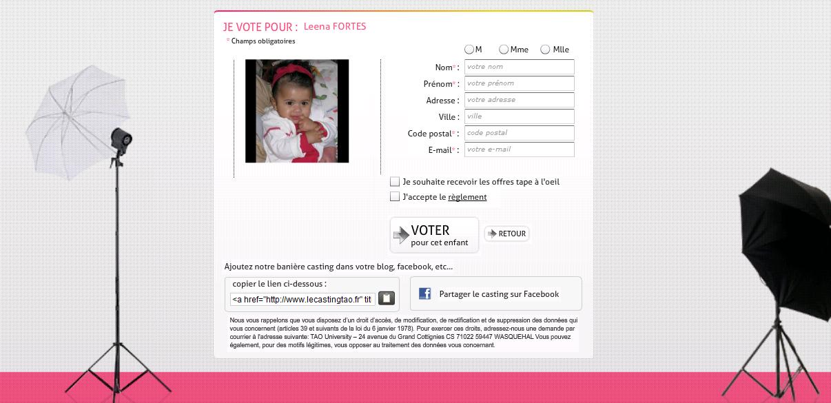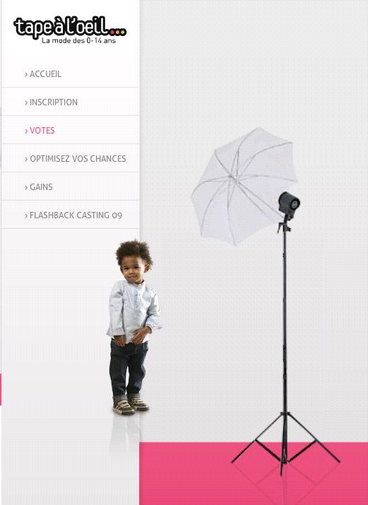 Tape à l’œil lance l’édition 2010 de son fameux casting « Tape à l’œil », du 23 mars au 23 mai 2010 TAO est “A la recherche des futurs mannequins Tape à l’œil” de 0 à 14 ans pour présenter les tendances de la rentrée 2010 !